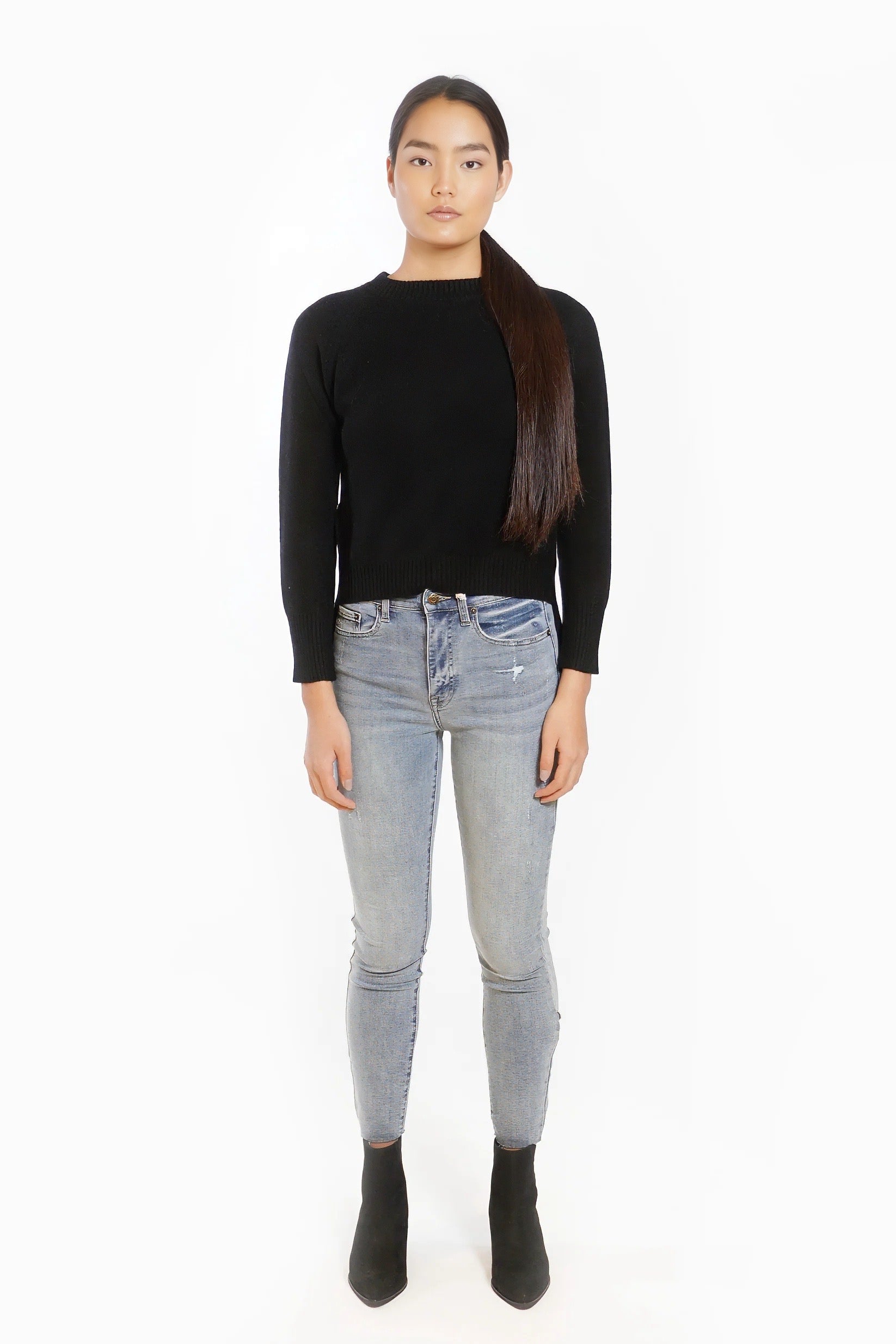 The Cashmere Backslit Sweater is unique while also classic, with a long cape back detail that modestly opens with an asymmetrical high to low cut.