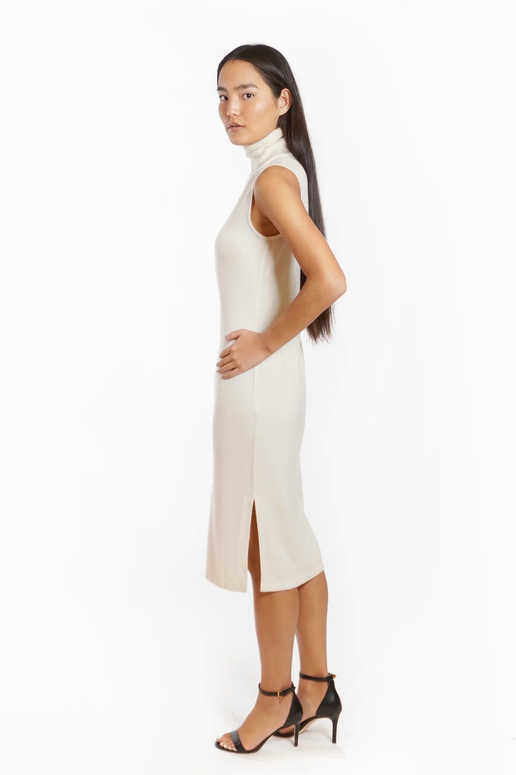 Elegance best describes this sleeveless turtleneck midi-length dress in 100% cashmere.